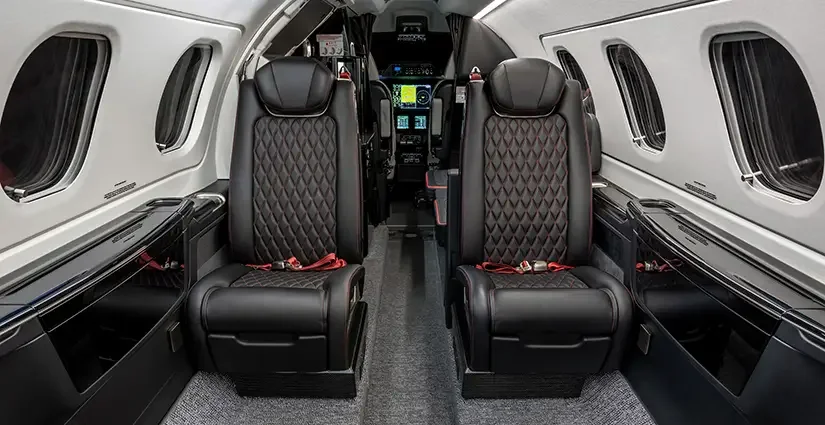 The Phenom 300E’s Oval-Lite cabin is built for comfort and modern luxury—wide aisles, generous headroom, and fully reclining seats with elegant leather finishes. Its advanced tech display, custom storage, and refined trim make it one of the most impressive cabins in its class.